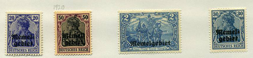 1920 Versalio sutarties nutarimai įsigalioja, Klaipėdos kraštas įgauna savivaldą. Tuo pat metu išleidžiami ir pirmieji Klaipėdos krašto pašto ženklai - prancūziškų pašto ženklų perspaudai su užrašu "Memel". Kartu pradedami naudoti ir vokiškų ženklų perspaudai su užrašu "Memel-Gebiet". Pašto ženklų nominalai nurodomi markėmis.