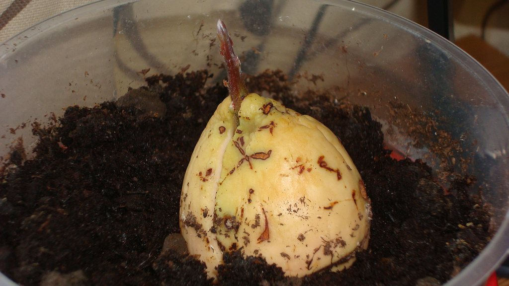 Aš net galėčiau sakyt, kad ir ta kita nuotrauka nukopijuota jei ne nuo kažkokio kito žmogaus tai tarkim nuo gamtos, va gi net be didelio interpretavimo - kokio nors avokado medelio, kuris išauga labai panašiu būdu iš į kiaušinį panašaus skylančio kauliuko (nuotraukoj) :wink: . Čia mano galva ne tokia genialiai unikali idėja, kad ją reikėtų nuo kažko nukopijuot :)