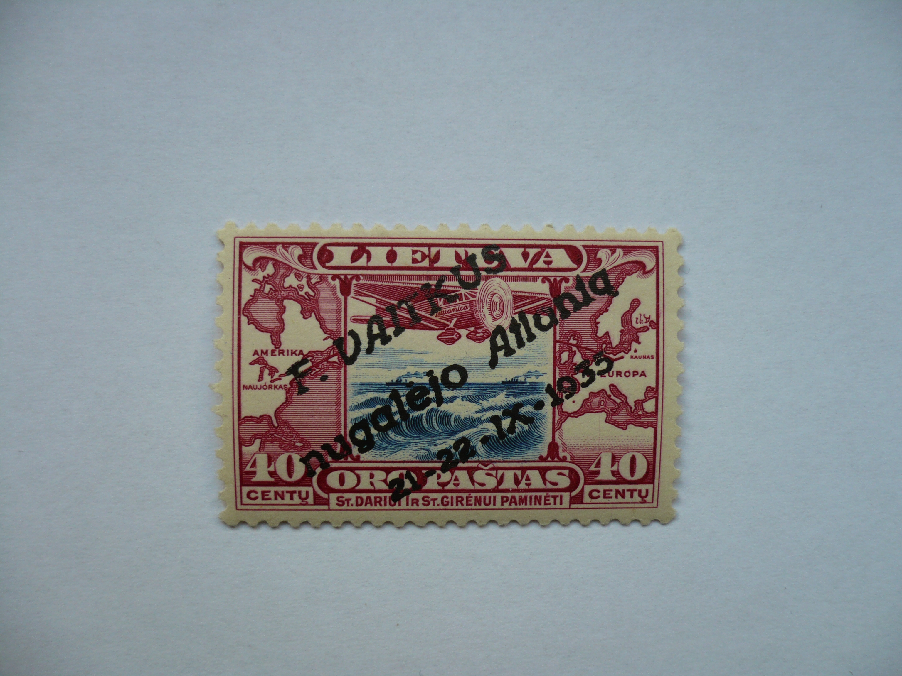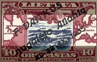 Turime pasto zenkla Perspausdinta Felikso Vaitkaus. Ženklas - vienas iš Dariaus ir Girėno laidos, perspaudas - įstrižas užspaudas "F. VAITKUS nugalėjo Atlantą 21-22-IX-1935".