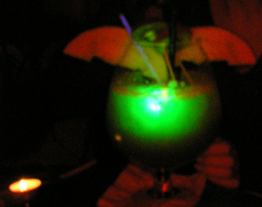 Taigi, užėjom į tą bariuką kokią pusę 3 nakties. Keturiese. Išgėrėme po vieną normalaus dydžio kokteilį ir du dideliuosius. Vienas iš jų buvo LABAI didelis, gal kokio litro didumo taurė. Kokteiliai skanūs ir įdomūs, verti, mano manymu, jei ir ne 10 balų, tai 9 - tikrai. Vienas iš įdomumų - daugelis tų kokteilių yra iliuminuoti, šviečiantys visokiomis spalvomis specialiomis švieselėmis ir vamzdeliais, žybčiojantys ir mirkčiojantys, taigi, atrakcija ne tik liežuviui, bet ir akims.