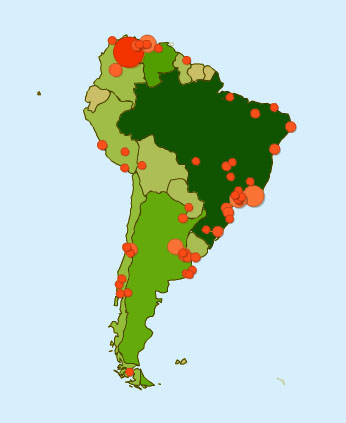 Žemėlapyje pavaizduotos labiausiai besilankančios Pietų Amerikos šalys (kuo daugiau lankytojų - tuo žalesnės) ir dažniausiai besilankantys miestai (kuo daugiau lankytojų - tuo didesni blynai).