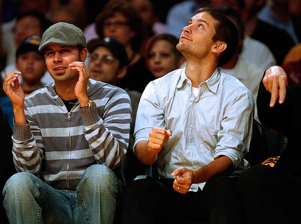 Failo aprašymas: Trilogijos apie "Žmogų - vorą" herojus Tobis Magvairas(dešinėje) žiūri Los Angeles "Lakers" sezono atidarymo rungtynes.