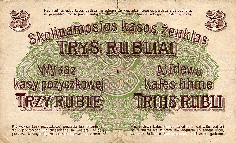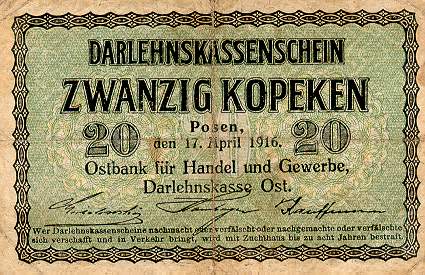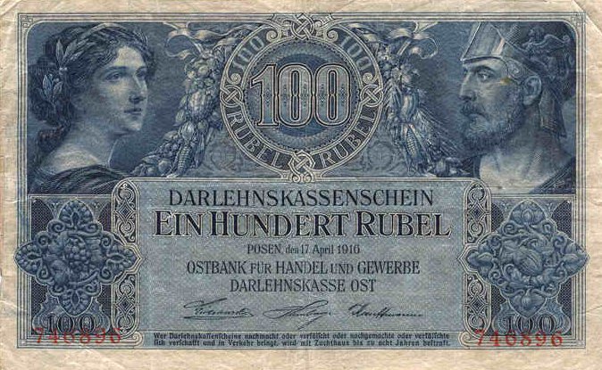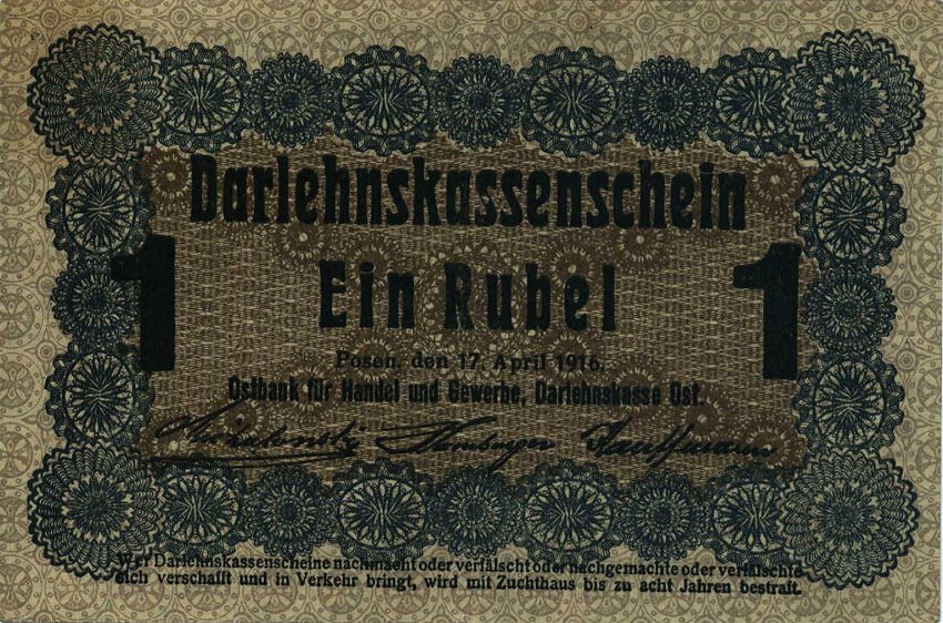 Darlehnskasse Ost - Rytų skolinamoji kasa 1916 vokietijos okupuotiems kraštams (Lenkijai, Lietuvai, Latvijai) išleido specialius okupacinius pinigus, turėjusius pakeisti vietinę valiutą. Užrašai ant pinigų buvo padaryti lenkų, lietuvių, latvių ir vokiečių kalbomis, pinigai pavadinti rubliais - mat reikėjo jais pakeisti carinius rusiškus pinigus. Tai, jei neklystu, pirmieji pinigai, turintys lietuviškus užrašus. Pinigai išleisti buvo Lenkijoje, Poznanėje (vok. Pozen).