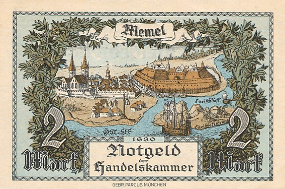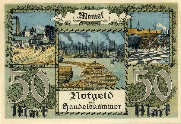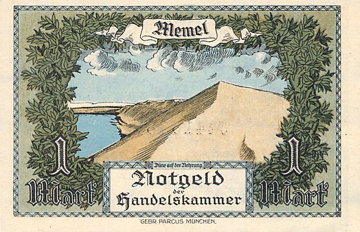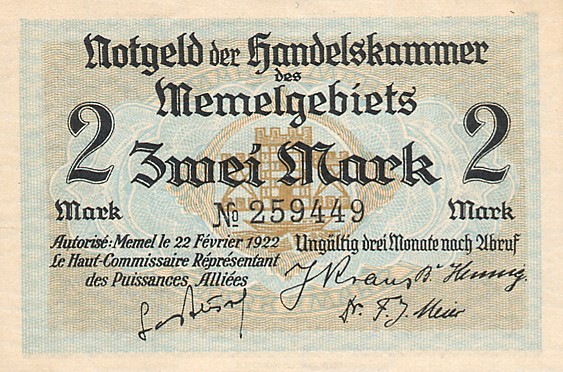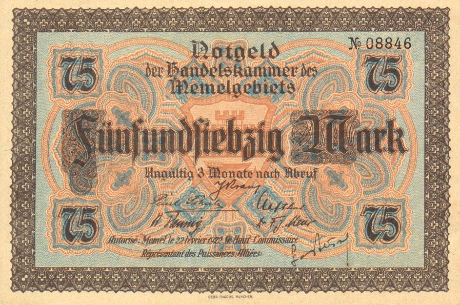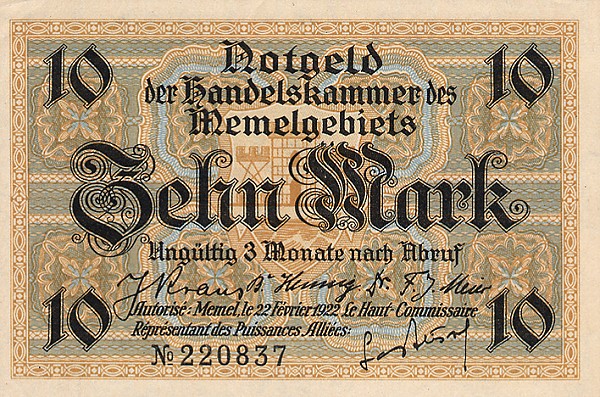 Po Versalio sutarties daugelis Vokietijos žemių tapo pusiau nepriklausomomis, o vėliau prasidėjusi ekonominė krizė su hiperinfliacija dar ir apsunkino pinigų leidybą, taigi, dalis buvusių Vokietijos teritorijų išleido savus pinigus. Tarp jų - ir Klaipėdos kraštas (Memelgebiet). Pinigų leidėjas - Tautų lyga, prancūzų okupacinė valdžia. Pinigai pasižymi gan ryškiu tautiškumu, juose vaizduojami ne tik Vakarų Lietuvos kraštovaizdžiai, bet ir kaimo buitis. Visgi, ant banknotų nėra jokių lietuviškų užrašų.