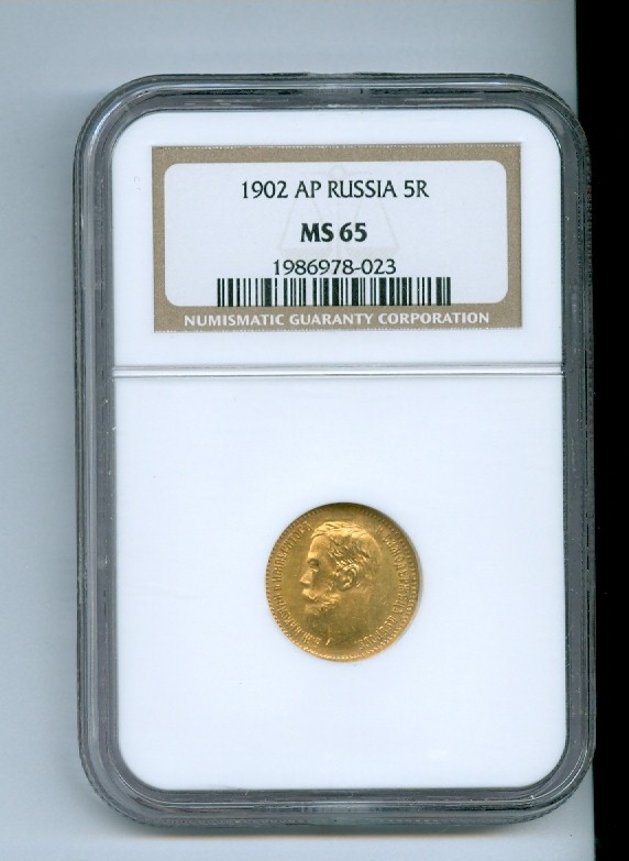 1902 Rusijos 5 auksiniai rubliai MS65, kaina 550 litu.