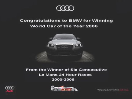 Failo aprašymas: AUDI sveikina BMW laimėjus geriausio pasaulio automobilio 2006 titulą.