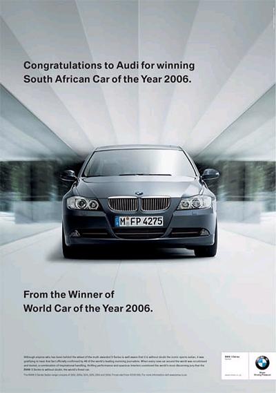 Failo aprašymas: BMW, geriausio pasaulio automobilio laimėtojas 2006, sveikina AUDI laimėjus geriausio pietų Afrikos automobilio titulą.