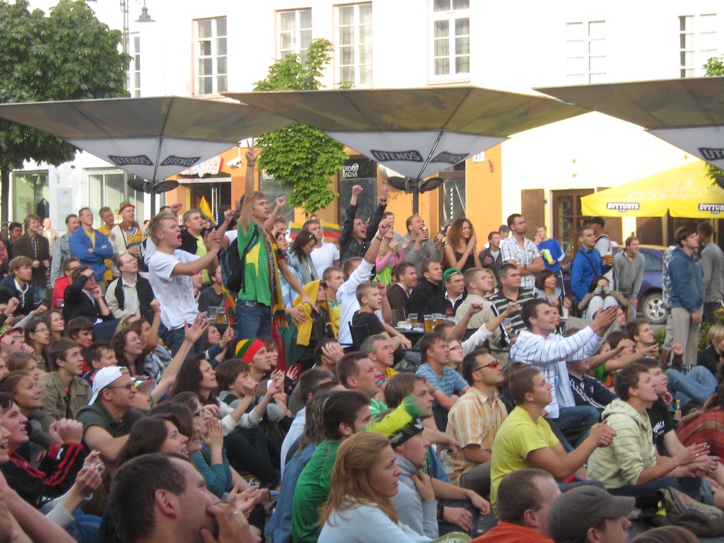 Failo aprašymas: Rotušės aikštėje susirinko nuo 300 iki 400 LT rinktinės palaikytojų, o didžioji dalis susirinko prieš didžiulį TV ekraną, tarp kurių verslininkas Marius Gelažnikas su megafonu rankose.