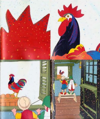 Knygelės sudarymo principas- kas puslapis- vis tolyn nuo gaidžio skiauterės. Tas matysis pirmame paveiksliuke.