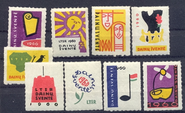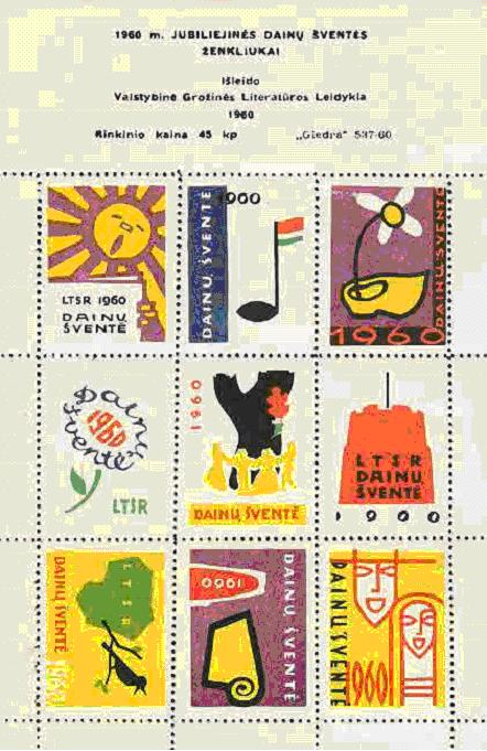 "1960 metais sovietų Lietuvos valdžia išleido tokių suvenyrinių ženklų! Tai yra devynių perforuotų ženklų lapelis, skirtas dainų šventei, kuri vyko Vilniuje, pažymint sovietų Lietuvos dvidešimtmečio sukaktį."