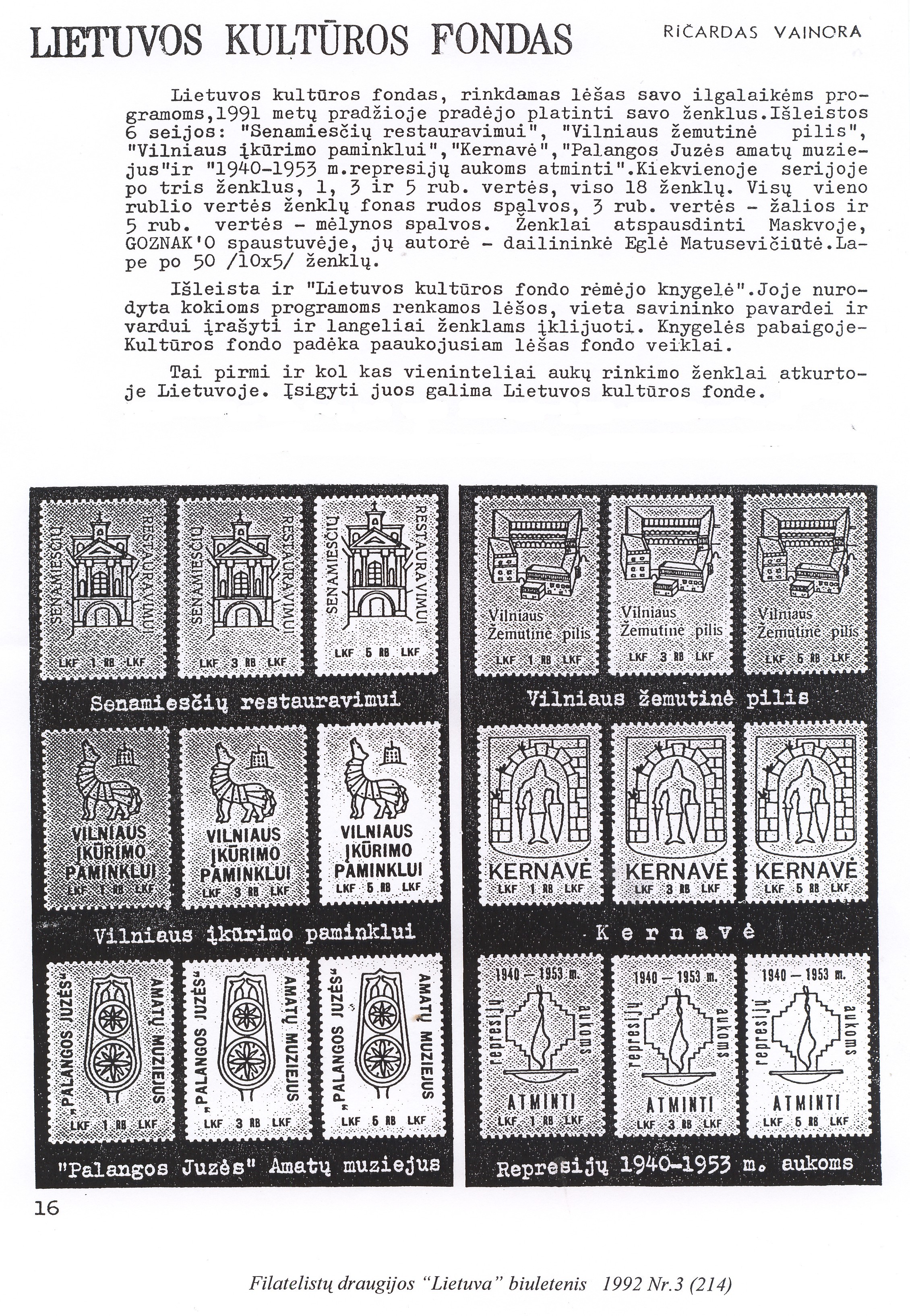 gal kas gali nurodyti kur labiau pasiskaityti apie zenklus, skirtus Zemutinei Vilniaus piliai, Senamiescio fondui, Palangos Juzes amatu muziejui ir kitiems muziejams - kiek suprantu ten iki 1992 m. leisti zenklai, nes turi 1, 3 ir 5 rb. nominalus.