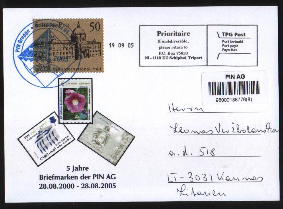 Laiškas iš Vokietijos persiūstas per Olandijos pašta (taip pat jau privatizuotą TNT)