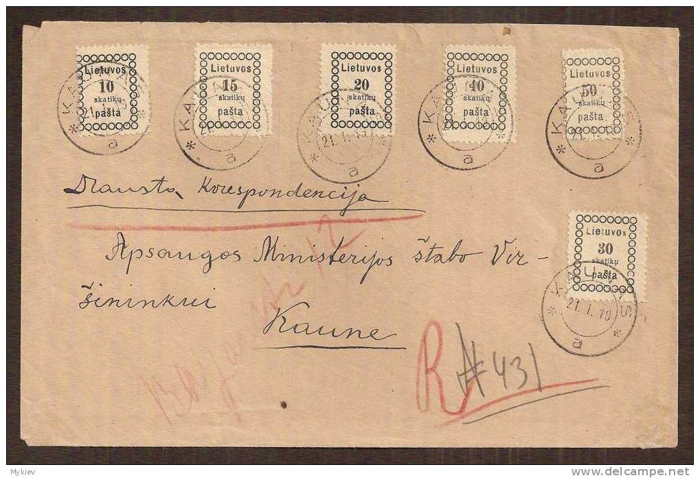 1919, Third Kaunas issue, complete set of six, sheet margin blocks of nine, representing different typesetting varieties, one stamp of 40sk has tiny tear, several blocks with perf separations, nevertheless very fresh, no gum as issued, VF and scarce multiples