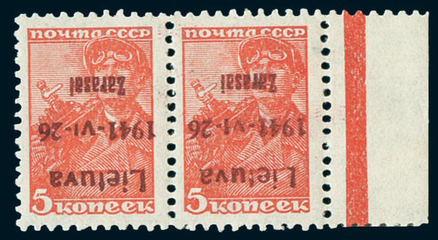 360 ** Zarasai. 1941 Russia 5K Brown-Red horizontal right margin pair showing 'overprint inverted' variety in brownish lilac, pos. 11-12. VF NH with Krischke photo attest. Trace of hinge remnant in selvage only. Rare multiple. (Mi 1bKI cat 15,000 euros =$18 $9,000.00