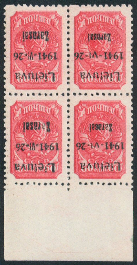 359 ** Zarasai. 1941 Russia 60K Carmine. Bottom margin block of four showing overprint inverted, pos. 3-4, 13-14. Pos. 3, 13 are Type I overprint; pos. 4, 14 are Type II overprint. VF NH with Krischke photo attest. (Mi 7aKI/II cat 1188 euros =$1,470) $700.00