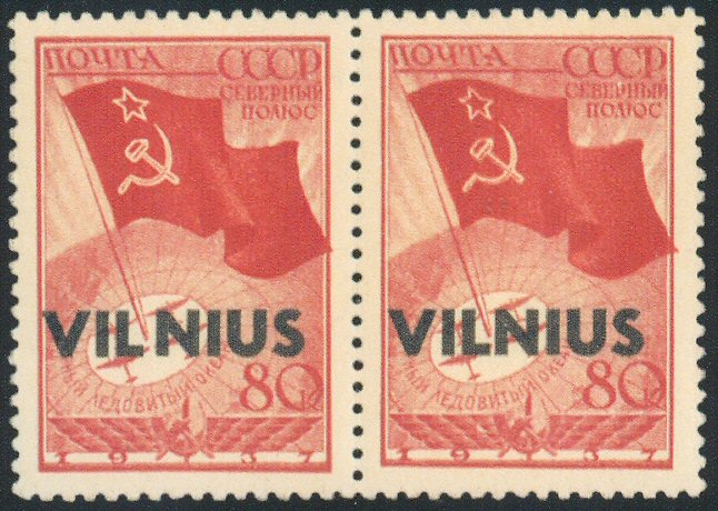358 * Vilnius. 1941 Russia 80K overprinted Vilnius horizontal pair, left stamp showing 0.95mm spacing between L and N in pair with normal for comparison, VF og LH. (Mi 17,1 cat 1300 euros = $1,690 as NH) $400.00