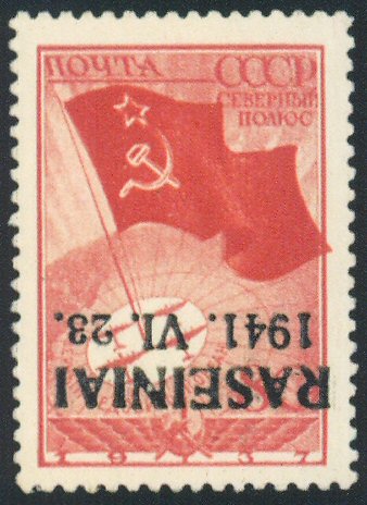 356 * Raesiniai. 1941 Russia 80K Carmine showing overprint inverted. VF og LH. Expertized Keiler with Krischke photo attest. Extremely scarce, only 25 issued. (Mi 8k cat 4500 euros =$5,600 as NH) $1,800.00