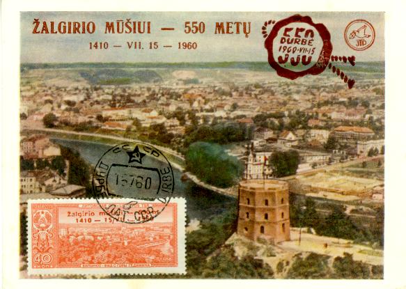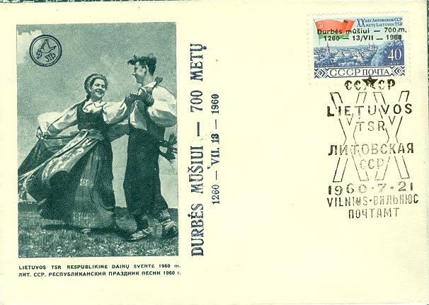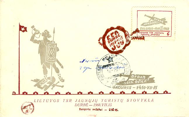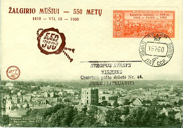 Durbe5.jpg - Toks pat vokas Durbės mūšiui, tik šį kartą prie jo priklijuotas TSRS pašto ženklas su Vilniaus vaizdu ir JTP užspaudu jame, skirtu Durbės mūšiui.
