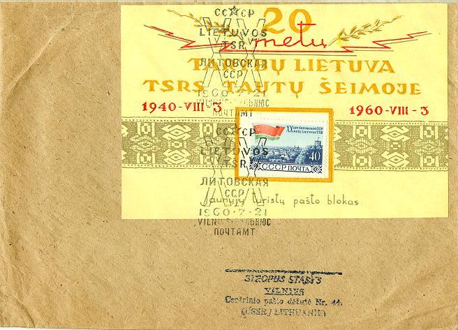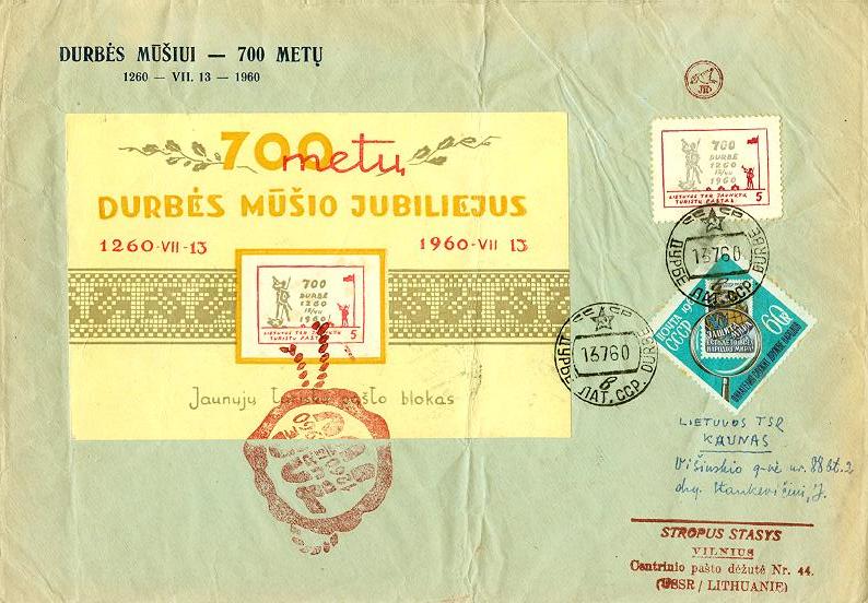 Durbe8.jpg - Vokas su suvenyriniu bloku skirtu Durbės mūšio jubiliejui, bei visu komplektu specialių užspaudų, siuntėjas - S.Stropus. Blokas atspausdintas be specialaus ženklo, o ženklas vėliau priklijuotas atitinkamoje vietoje bloke (bent jau sprendžiant iš mano turimo, panašaus bloko skirto 20 metų LTSR sukakčiai).