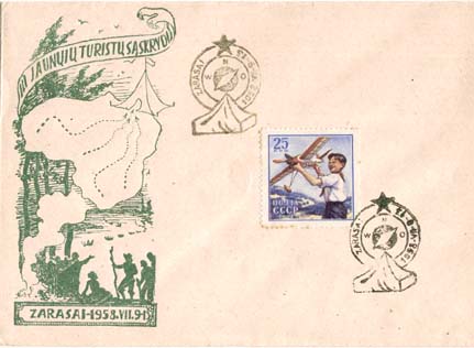 Failo aprašymas: Tai - mano turimas JT sąskrydžio vokas, skirtas Zarasuose 1958 m. liepos 9 -13 dienomis vykusiai III JT stovyklai. Vokas įdomus tuo, kad jame visas tekstas atspausdintas tik lietuvių kalba, tas pat pasakytina ir apie abejus suvenyrinius antspaudus. Tik SSSR 10 kap pašto ženklas - labai jau idėjinis...