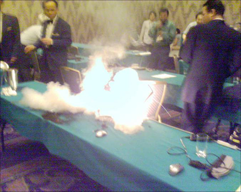 Liudininkų teigimu, laptopas užsidegė ir sprogo visiškai be priežasčių. Laimingo atsitiktinumo dėka kompiuterio savininkas tuo momentu buvo atsitraukęs per kelis žingsnius, todėl liko gyvas, tik šiek tiek apsvilęs. Kito atsitiktinumo dėka, vienas iš konferencijos dalyvių kaip tik darė nuotrauką savo mobiliu telefonu, todėl buvo užfiksuotas pirmo sprogimo momentas.