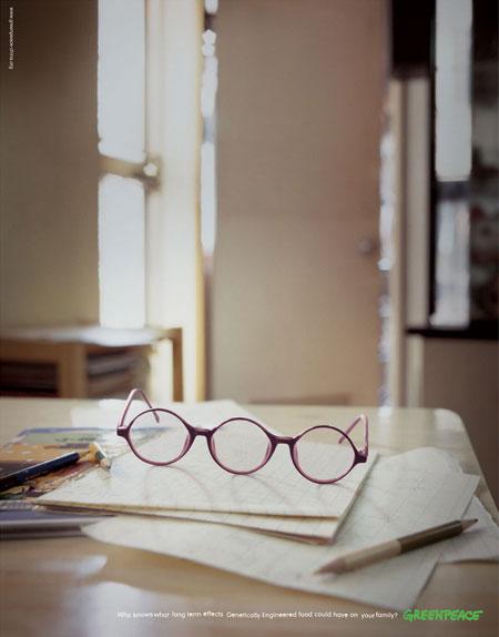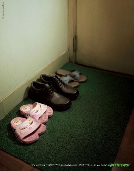 Greenpeace Kinijos skyriaus užsakyta reklama, siūlanti vengti genetiškai modifikuotų produktų. Reklamos šūkis - "Who knows what long term effects Genetically Engineered food could have on your family" - "Kas žino, kaip ilgainiui tavo šeimą paveiks genetiškai modifikuoti produktai".