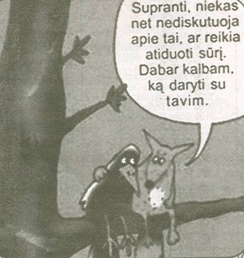 * (Šuo su dilda) - O pabandykite tam šuniui paaiškinti kad jam nešvanku taip vaikščioti ir nešiotis tą dildą? Jis gi turi visai kitokį požiūrį, todėl juokinga ne tai, kad jis nešasi įsikandęs dildą, o tik tai, kad mes bandome primesti savo moralę šuniui ir stebimės jo elgesiu