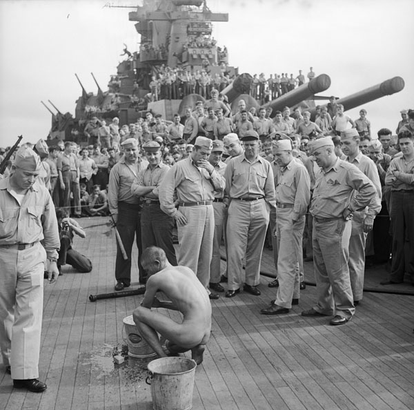 "Japanese prisoners of war are bathed, clipped, "deloused," and issued GI clothing as soon as they are taken aboard the USS New Jersey"