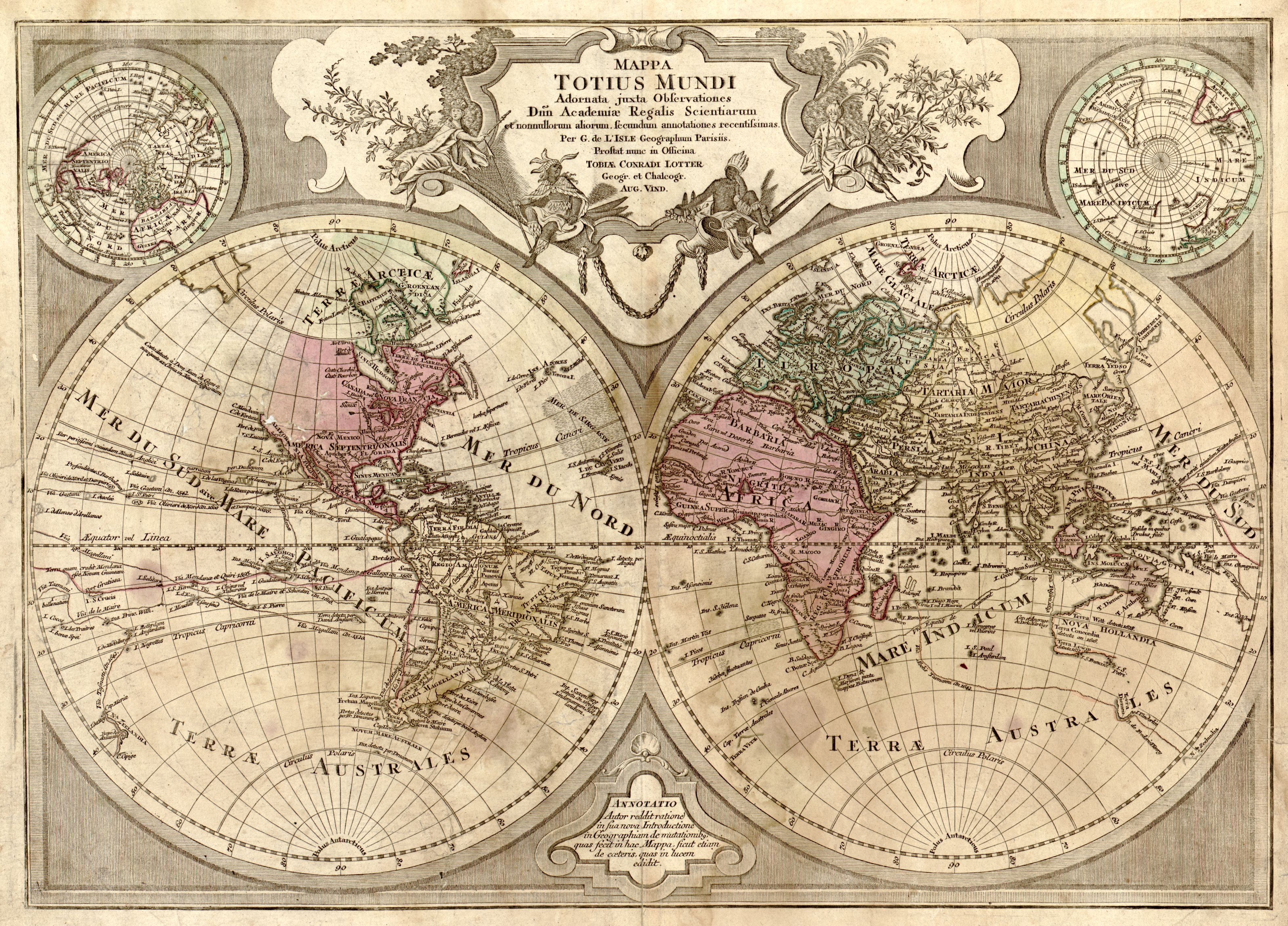 "Mappa totius mundi : adornata juxta observationes dnn. academiae regalis scientiarum et nonnullorum aliorum secundum annotationes recentissimas", per G. de L'Isle, 1775.