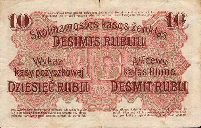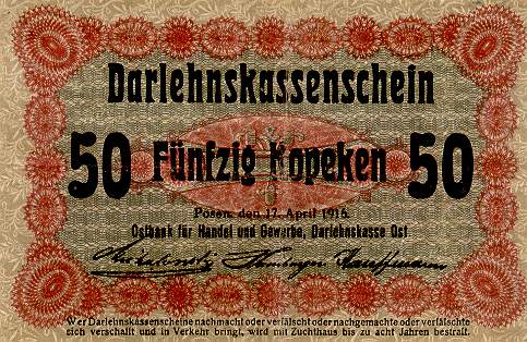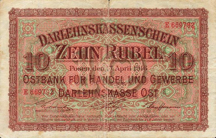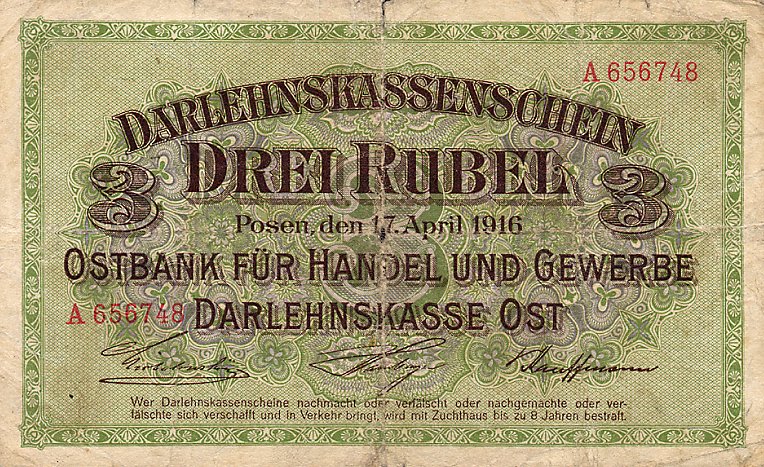Darlehnskasse Ost - Rytų skolinamoji kasa 1916 vokietijos okupuotiems kraštams (Lenkijai, Lietuvai, Latvijai) išleido specialius okupacinius pinigus, turėjusius pakeisti vietinę valiutą. Užrašai ant pinigų buvo padaryti lenkų, lietuvių, latvių ir vokiečių kalbomis, pinigai pavadinti rubliais - mat reikėjo jais pakeisti carinius rusiškus pinigus. Tai, jei neklystu, pirmieji pinigai, turintys lietuviškus užrašus. Pinigai išleisti buvo Lenkijoje, Poznanėje (vok. Pozen).