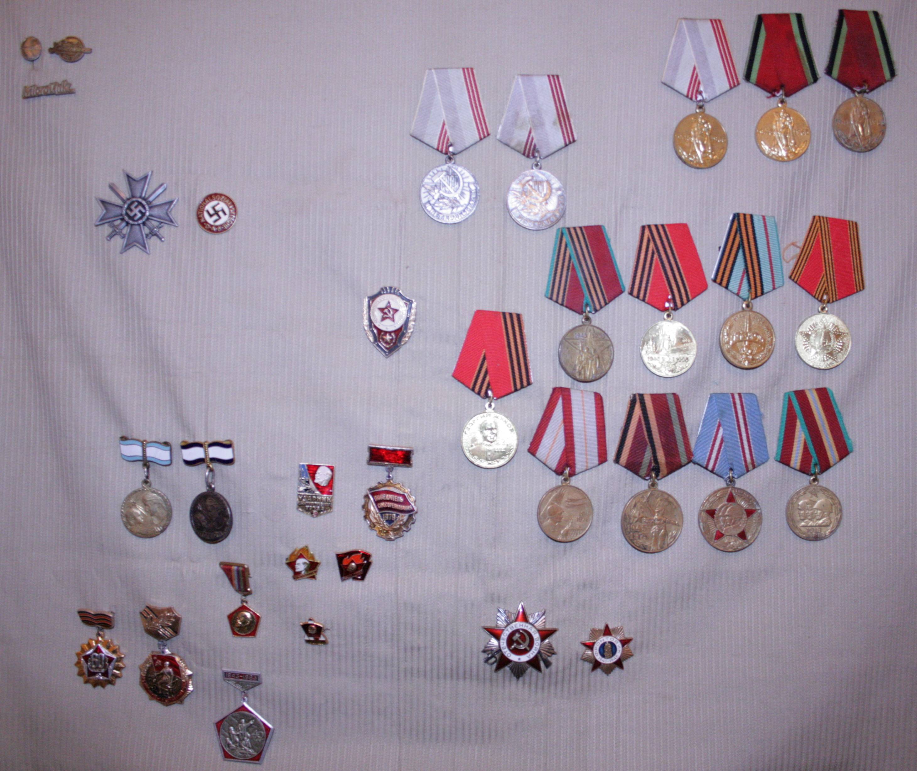 Ale per kažkiek laiko vėl susikaupė kažkiek turto - šįsyk gal ir truputį įdomesnio, nors ir ne itin vertingo. Tai vat, iškabinu aną nuotraukoj, kad pasidžiaugčiau su jumis. Aišku, čia irgi nieko gero - vienintelis sovietinis "Didžiojo tėvynės karo" ordinas vertas kelių dešimčių litų, o kiti - išvis smulkmė. Vokiški - pigios kopijos. Ale visvien gražu, tiesa?