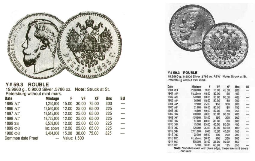 Sutinku su KristisMZ, tai didžiausio tiražo rublis (1989m.), šitie rubliai brangesni nuo poros, trijų iki kaip Kristis minėjo daug kartų, išleisti tik po 1901m. (aišku irgi ne visi). Dėl stovio nežinau, iš nuotraukos matos įmušimų ir gurto pažeidimų nors gal tokia nuotrauka, kurioj viskas labai išryškėja. Bet kaina kol kas tikrai ne svarstymų ribose, tam pačiam pirkyje yra pigesnių variantų :) . Na aš pasuoju, šiaip jei įdomu pridedu katalogų (19 ir 20a.) rublių aprašymą: