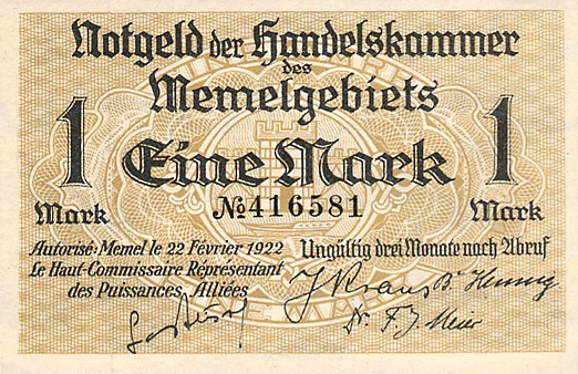 Po Versalio sutarties daugelis Vokietijos žemių tapo pusiau nepriklausomomis, o vėliau prasidėjusi ekonominė krizė su hiperinfliacija dar ir apsunkino pinigų leidybą, taigi, dalis buvusių Vokietijos teritorijų išleido savus pinigus. Tarp jų - ir Klaipėdos kraštas (Memelgebiet). Pinigų leidėjas - Tautų lyga, prancūzų okupacinė valdžia. Pinigai pasižymi gan ryškiu tautiškumu, juose vaizduojami ne tik Vakarų Lietuvos kraštovaizdžiai, bet ir kaimo buitis. Visgi, ant banknotų nėra jokių lietuviškų užrašų.